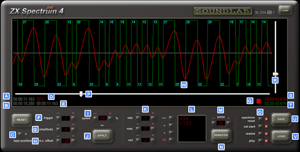 With the above in mind if we are trying to load a standard LOADer piece of code we can check pulses for length to see if they are far larger than they should be or far smaller again theres a lot of room for movement but you can use the speedcontrol I to shrink or grow the overal pulses adjust the size by few % and press apply you will immedaitely see the effect it has had, You can then press the LOAD and see if its better you'll then chnage a bit more if it fails and try again... then repeat. Wow and Flutter from the cassette deck and or tape in the original wave can play a part of stretching and compressing the wave across its entire length so things can speed up or slow down at any point, best option is not to get to held up on this (the spectrum has a great deal of wriggle room here) and if the leader has pulses from 26 - 31 you should be fine (consistently is key) if all the pulses were 32 or greater then its quick and easy just to try a speed up (to bring the lengths to around 28) and test again, You may have a slow cassette deck through age and all the tapes may come out slow this is easy to work with and you'll get to know the deck if you do a lot of captures.